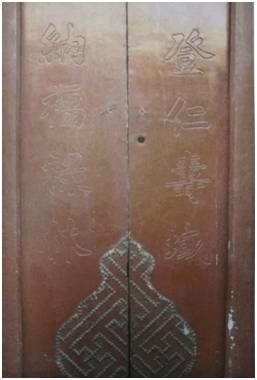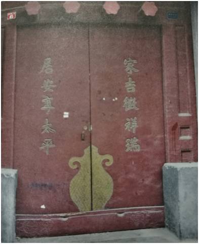 這類門板楹聯反映的是宅院主人對美好生活的期盼和詠歎。如中蘆草園胡同23號的“國恩家慶,人壽年豐”,燈市口西街17號的“時和景泰,人壽年豐”,粱家園西胡同25號的“家祥人壽,國富年豐”,草廠七條9號的“登仁壽域,納福祿林”,南蘆草園胡同17號的“聿修厥德,長發其祥”,西四北頭條23號的“九州承泰,四季長春”,西打磨廠45號的“家吉征祥瑞,居安享太平”,興盛胡同12號的“瑞霞籠仁裏,祥雲護德門”,楊梅竹斜街13號的“山光呈瑞象,秀氣毓祥暉”,培英胡同33號的“門前清且吉,家道泰爾康”,模式口李家的“象祥世衍無疆慶,國泰天開不老春”,等等。