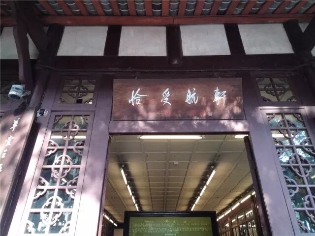 恰受航軒為工部祠前左側配廡,與“水竹居”相對稱,因其建築形狀狹長如舟,清嘉慶十六年(1811)重修時,即以杜甫草堂詩作《南鄰》中“秋水才深四五尺,野航恰受兩三人”兩句詩意命名。此匾由陳毅先生於1966年書。