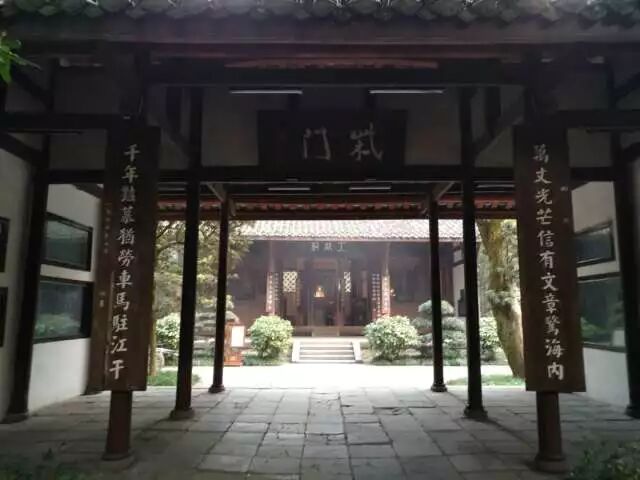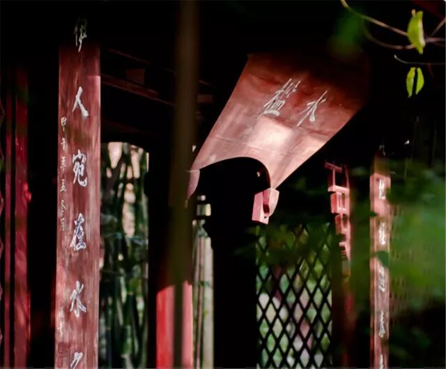 杜詩中描寫的水檻,當指建築於水邊供休憩潛心的簡易建築物。上元元年(760)杜甫建成草堂後,又不斷培植修葺,擴大規模。上元二年,草堂內新建成水檻。今水檻位於中軸線第四重建築“柴門”之西,跨溪流而映綠竹,此匾由著名數學家何魯先生書。