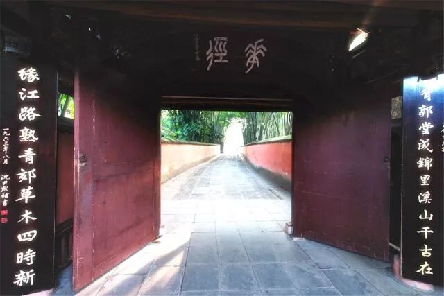 此聯出自杜甫《懷錦水居止二首》一詩,楹聯曾經被毀,1964年由著名書法家馬公愚先生補書。詩句中“萬裏橋”就是今天成都的老南門大橋。三國時,蜀國大臣費禕出使東吳,此行聯吳抗魏,任重道遠,諸葛亮在此橋頭送別費禕。費禕感慨萬千,對諸葛亮說到“萬裏之行,始於此矣。”這座橋由此得名為“萬裏橋”。