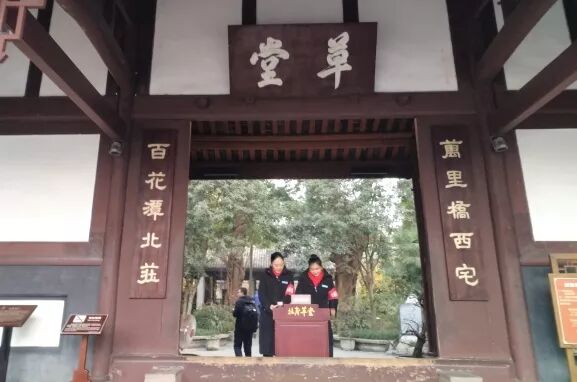 上聯說成都草堂永遠留存後世,受人瞻仰。下聯指杜甫的詩歌昭著千秋,流芳百世。1957年,朱德元帥來到我館參觀時有感而發,撰寫出此聯。對聯言簡意賅,高度頌揚了草堂這塊文學聖地和杜甫彪炳天地的詩歌成就。