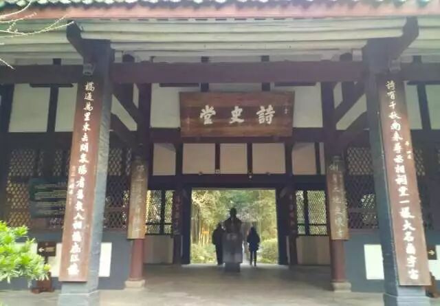 此匾由邵章先生補書,清嘉慶十六年(1811)重修草堂竣工,將工部祠前大堂命名為“詩史堂”,詩史堂是杜甫草堂主要的紀念性建築之一。