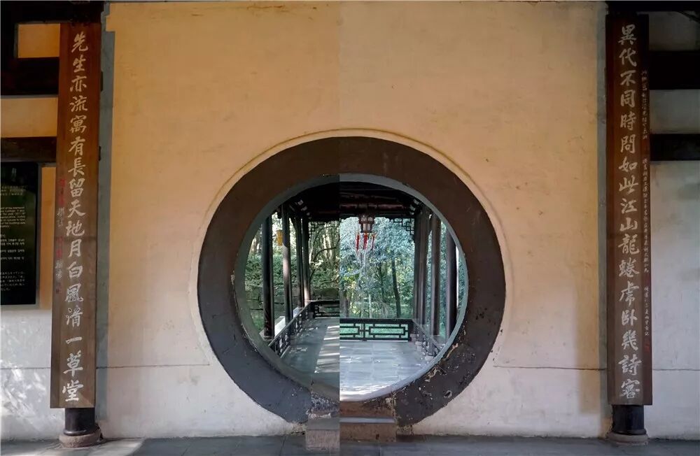 此匾懸於“花徑”東端入口處,由著名書法家沈尹默補書匾。正如杜甫居草堂時,曾在《客至》詩中寫道:“花徑不曾門客掃,蓬門今始為君開。”