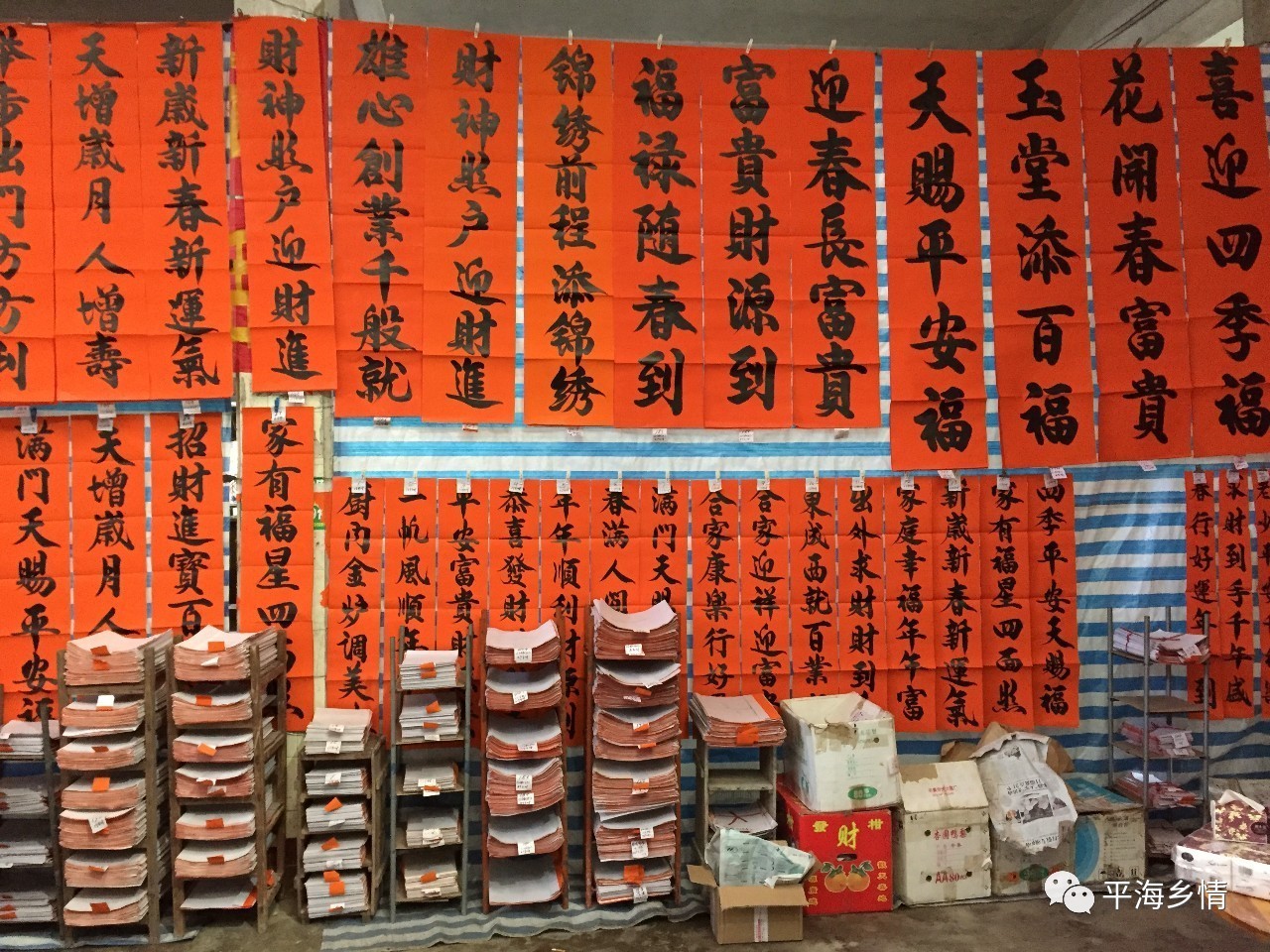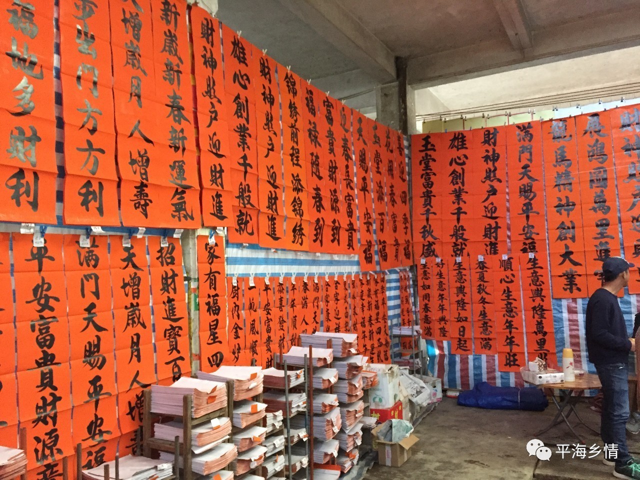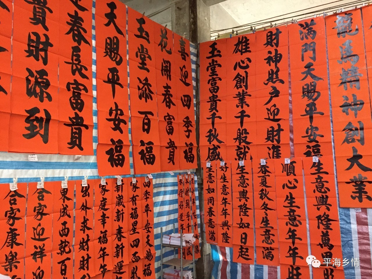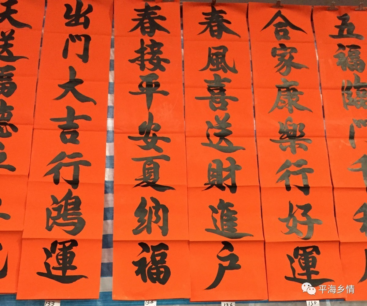 每年春節前,平海市場大大小小數十個賣春聯檔位,擺放著各式各樣的春聯,濃濃的年味撲麵而來。這些春聯80%都是本土書法家書寫,字體或行書、或楷書、或隸書。聯句盈盈著人們對新一年美好的向往與願望。