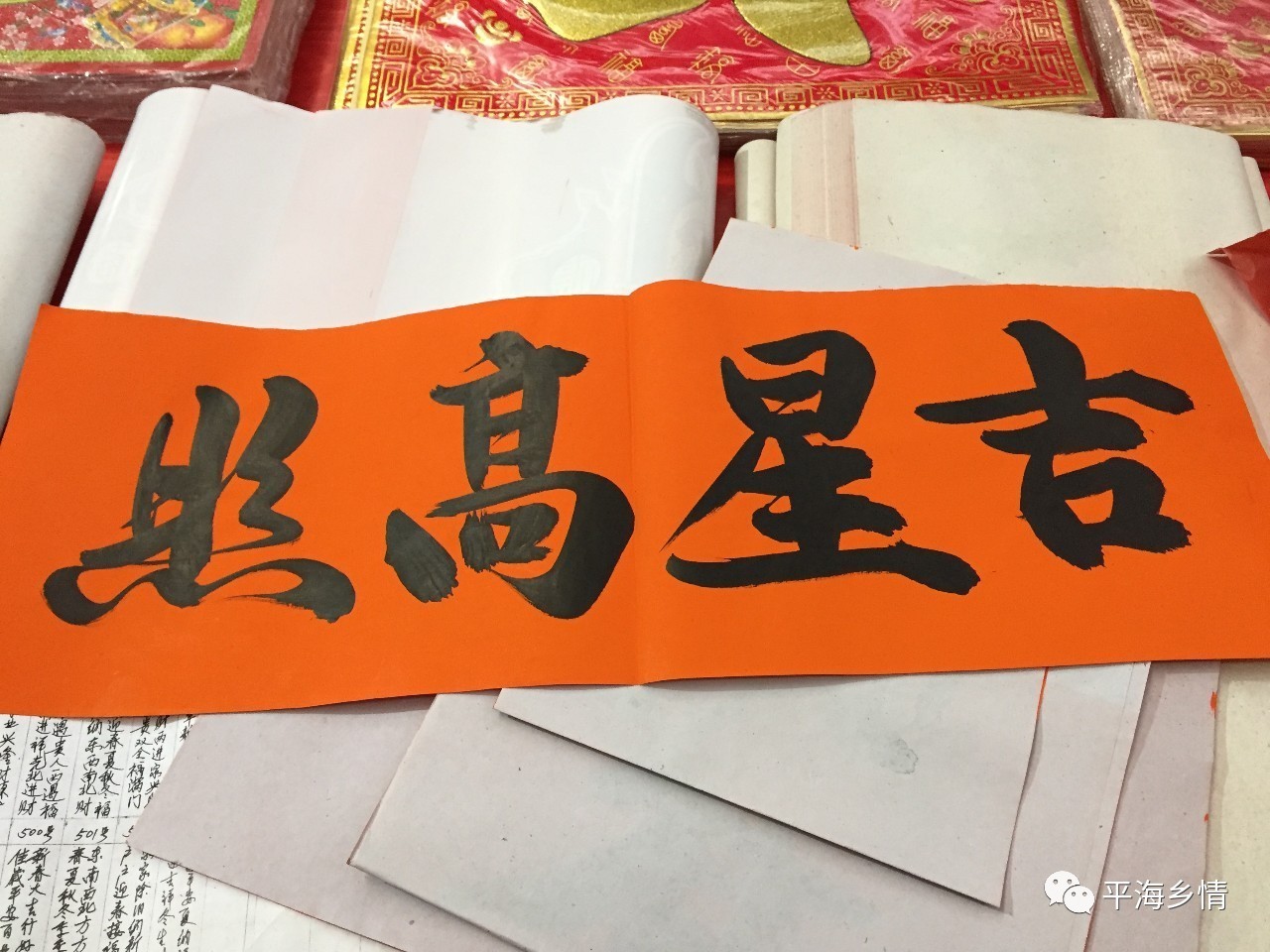 不管那一種聯意,那一種形式,那一種對仗,長聯或短句,平海對聯的最大特色,全都是書寫在俗稱“丹紙”上,據說是因平海臨近大海,氣候潮濕,日照較長,而“丹紙”卻永不退色。