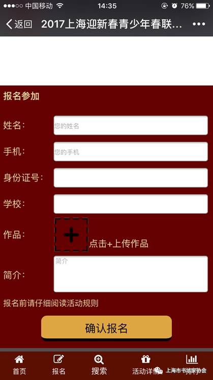 4.請填寫正確的姓名(必填) 、手機號碼(必填) 、身份證號(選填) 、學校(選填) 並把春聯作品 跟小朋友手拿作品的照片 上傳,填寫作品簡介 (選填)。最後點擊“確認報名”按鈕完成提交。