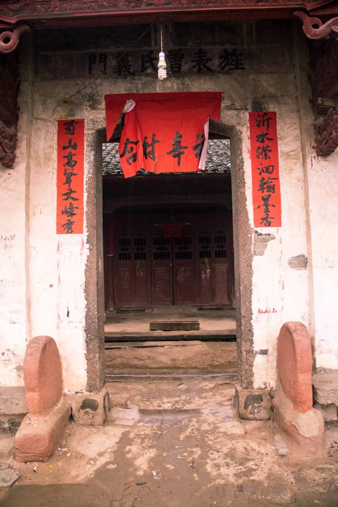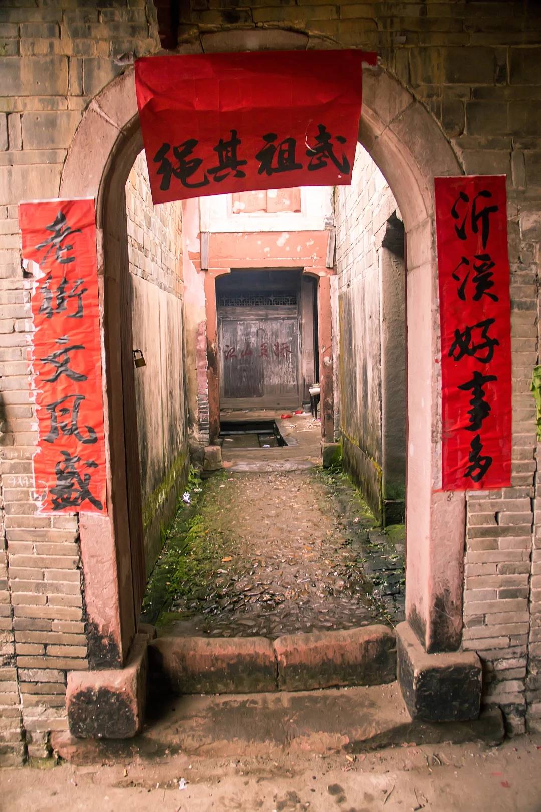 沂溪老房子的門柱,有的直接就是青磚築起,有少數用紅沙石條。依我看,石條做門柱的,可能是條件好的人家。這紅沙石好看,顯氣派,尤其是,這石柱上往往鑱刻高雅的對聯,上框石又浮雕,意願家安庭睦,或者後輩勤學有為。透過有一些剝落的門柱,注意到三幅門聯,“牆前翠竹新詩料,門外青山古畫屏”,“光淩彩鳳天邊日,秀奪金鼇海上春”,“聖代即今多雨露,文昌新入有光輝”。沂溪先人之人文雅韻,可略見一斑。